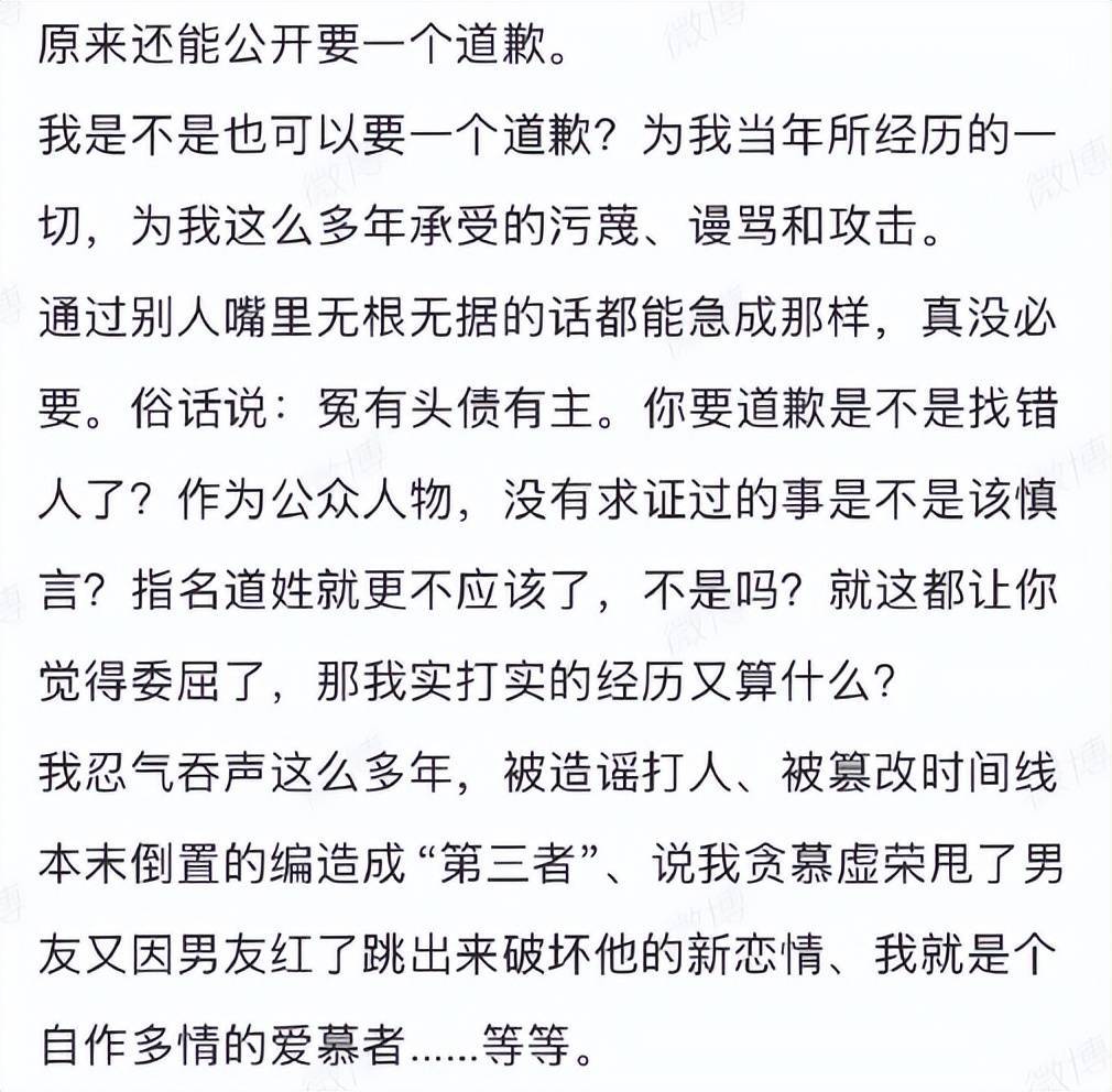 她表示:“原来还能公开索要道歉,那我是不是也可以要一个?为我当年所经历的一切,为我多年来承受的污蔑、谩骂与攻击。”