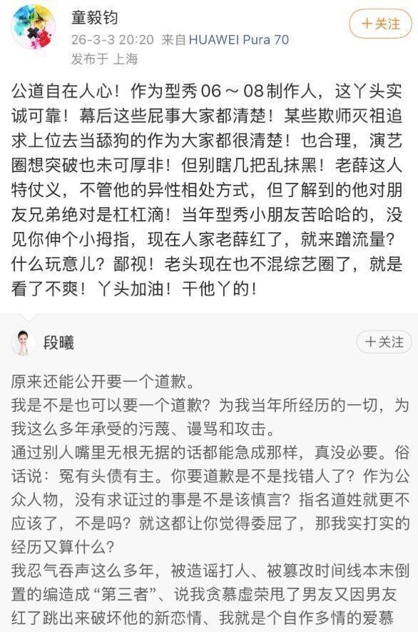 前《我型我秀》制作人童毅钧也在网上声援段曦,暗示幕后之事大家心知肚明,还暗指张杰欺师灭祖,为上位当舔狗。