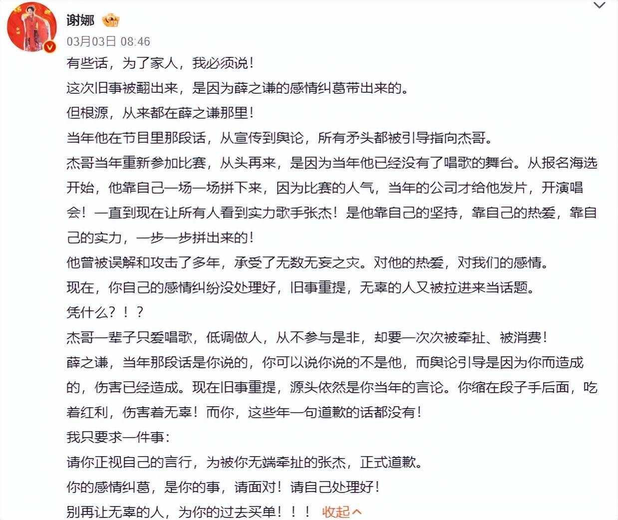 没想到谢娜随后下场,在个人账号公开喊话薛之谦,要求其向自己老公道歉。