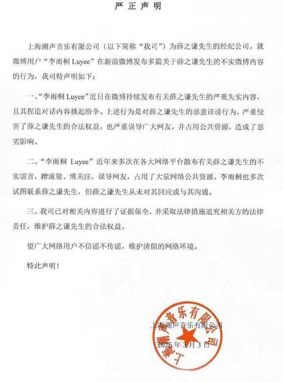 薛之谦方发布声明,已完成证据保全并将采取法律措施,主要针对李雨桐发言,未提及谢娜和段曦之事。